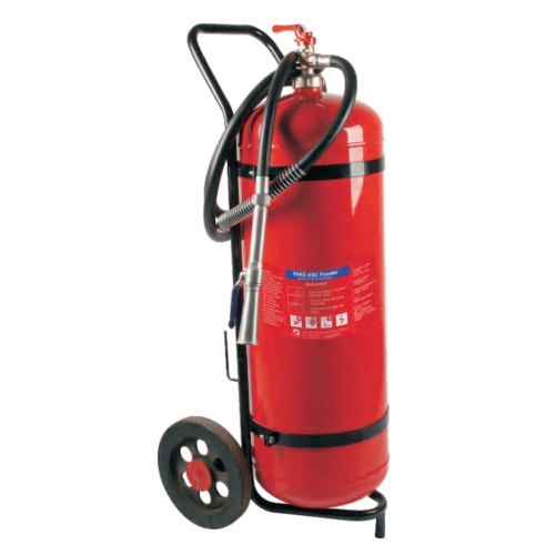 Meeting CE standards, this substantial 50kg trolley-mounted fire extinguisher offers a significant firefighting capacity for high-risk environments. Its wheeled design ensures swift deployment to critical areas.